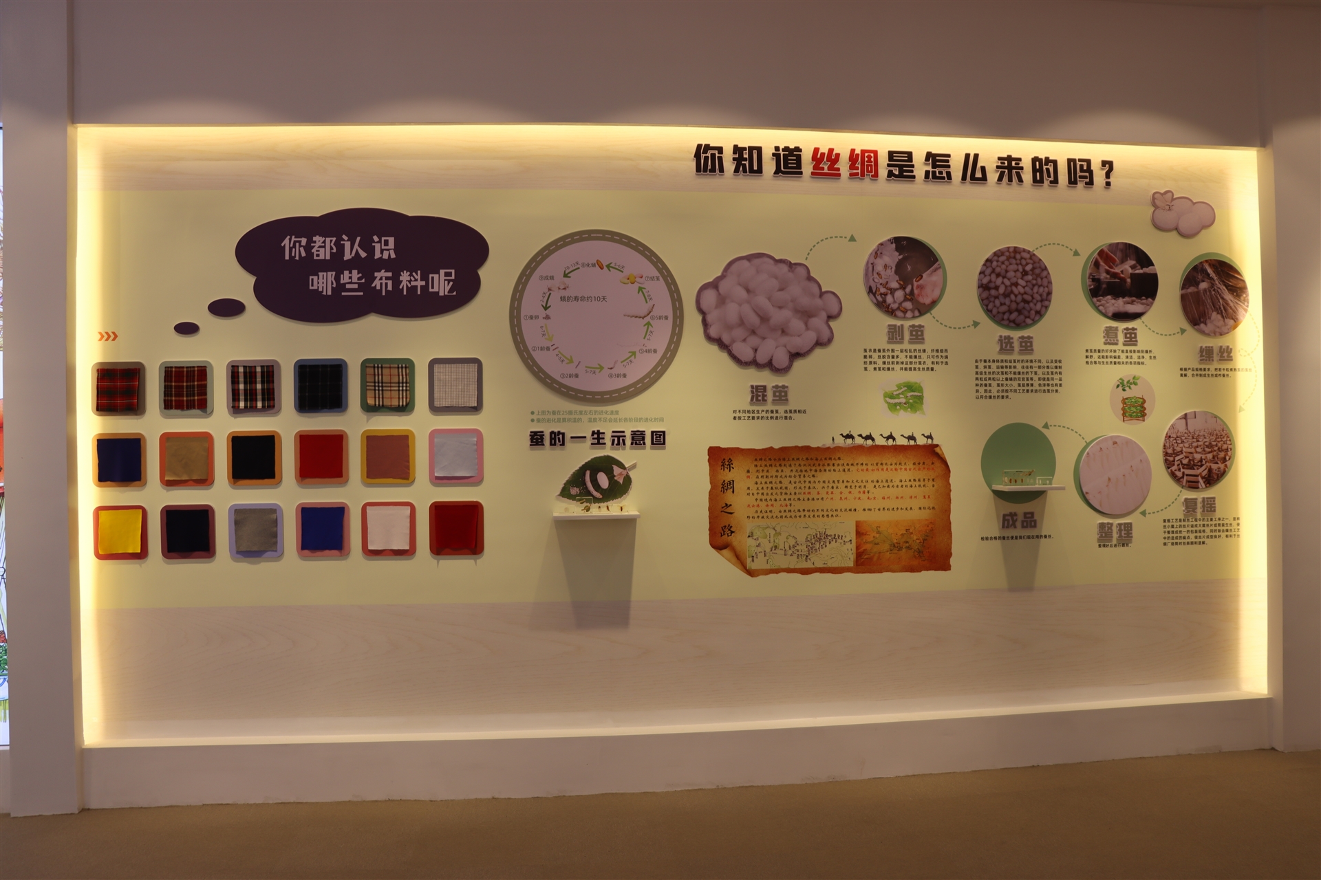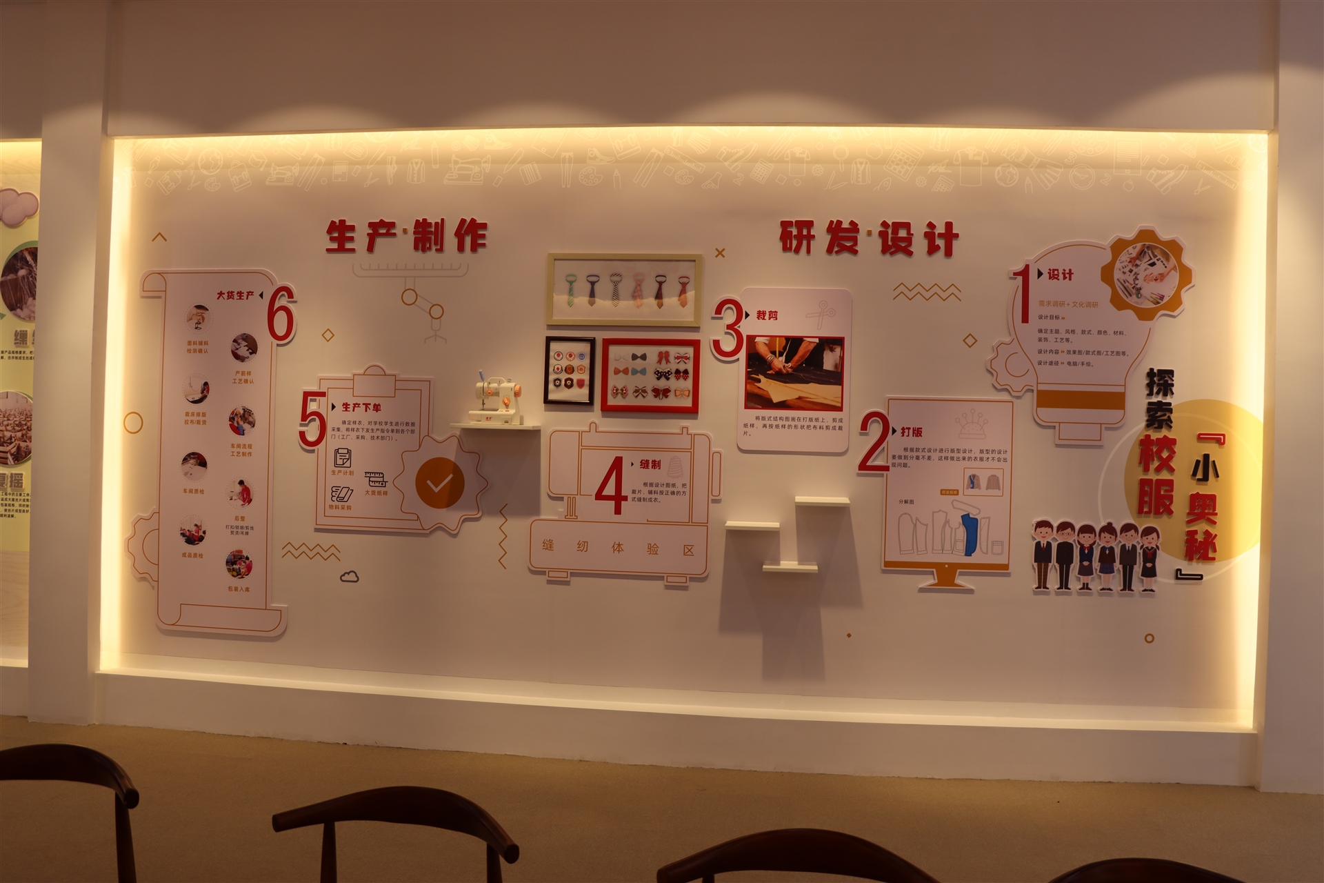 科普館是以校服與學校教育相結(jié)合的科普宣傳基地,在這里可以認識服裝面料的來源、種類,學習不同時代、不同款式傳統(tǒng)經(jīng)典服飾的特點,更能深刻了解一件校服的制作過程,該展區(qū)同時設置了DIY縫紉體驗區(qū),可以體驗裁剪的樂趣。