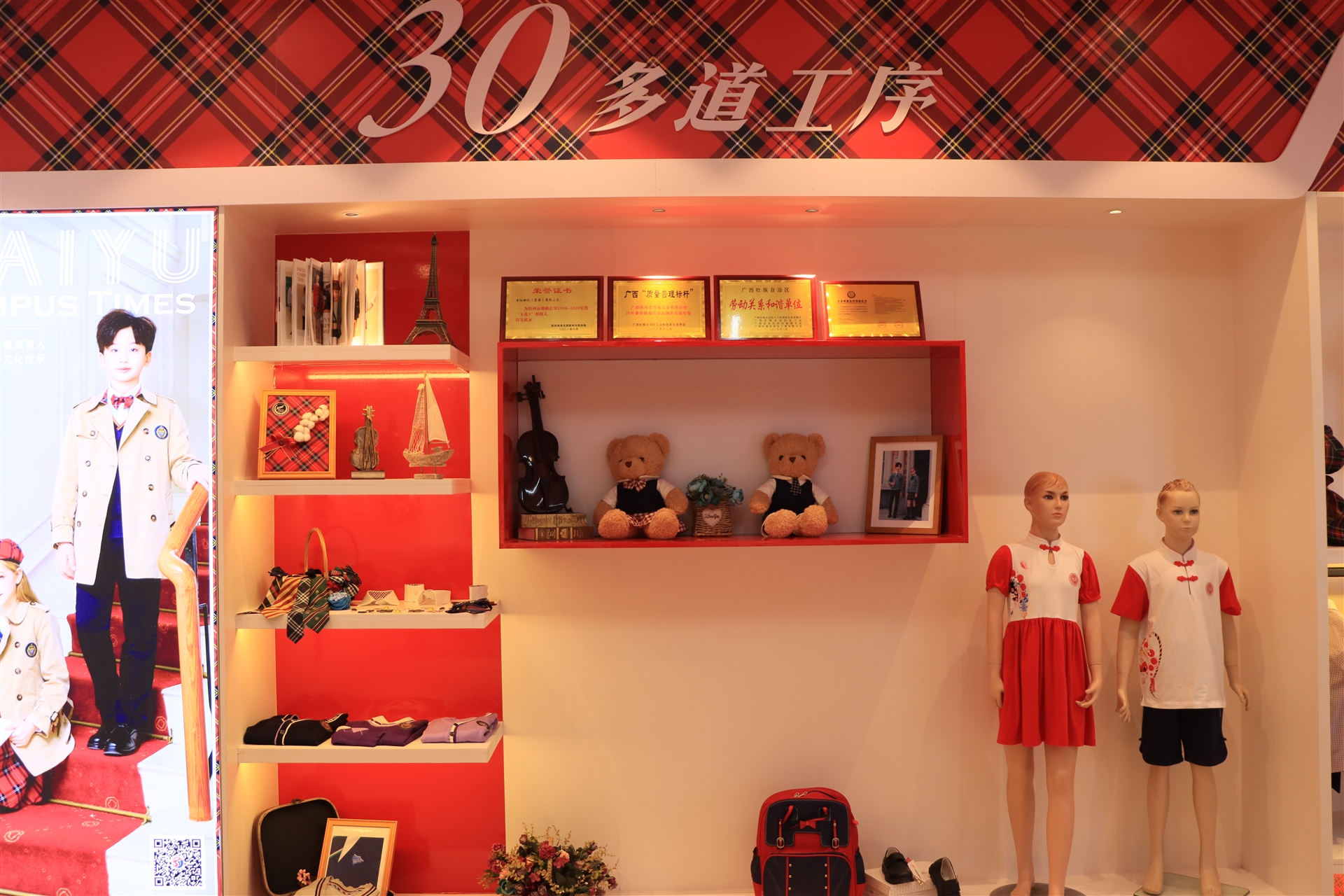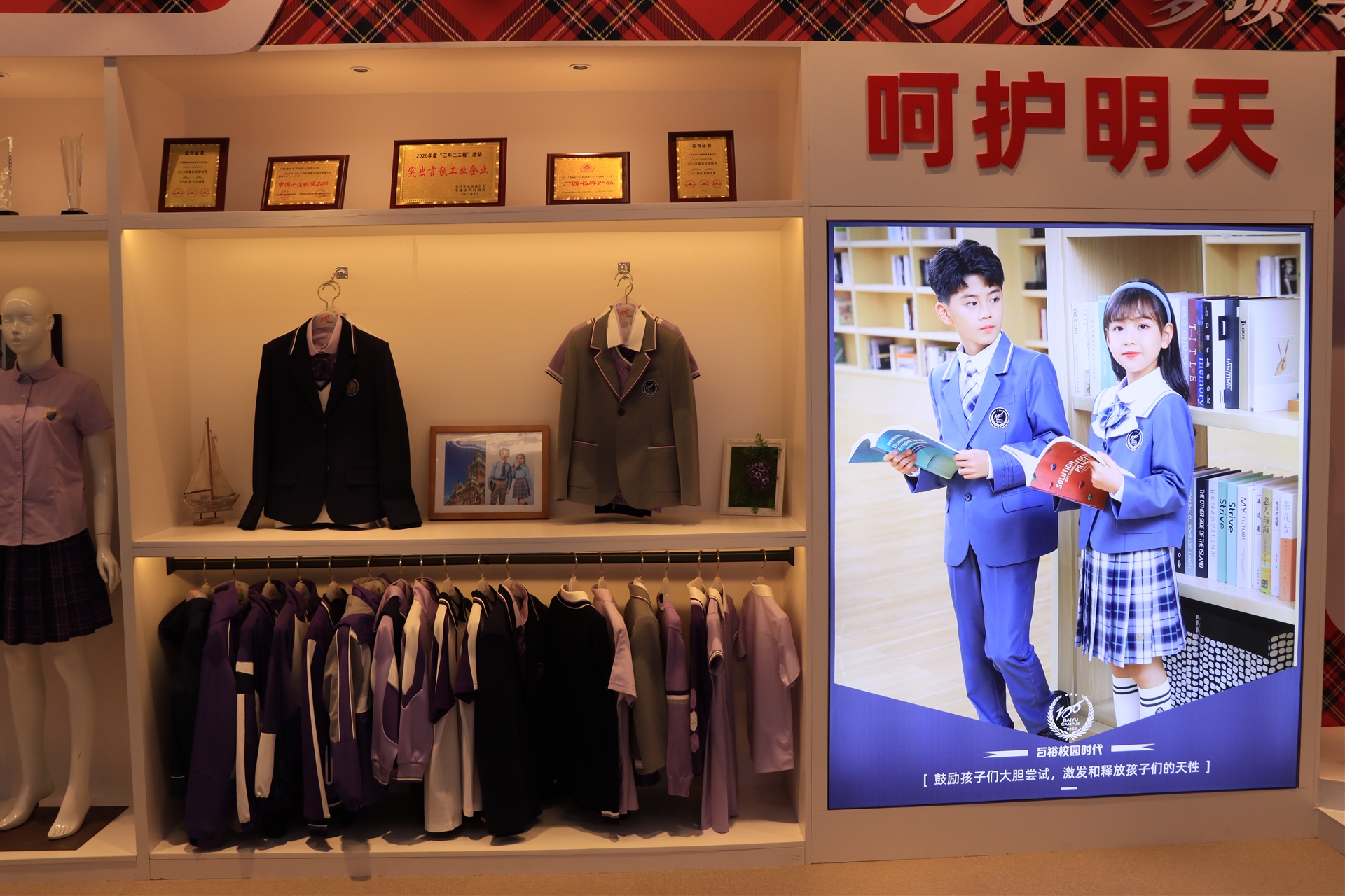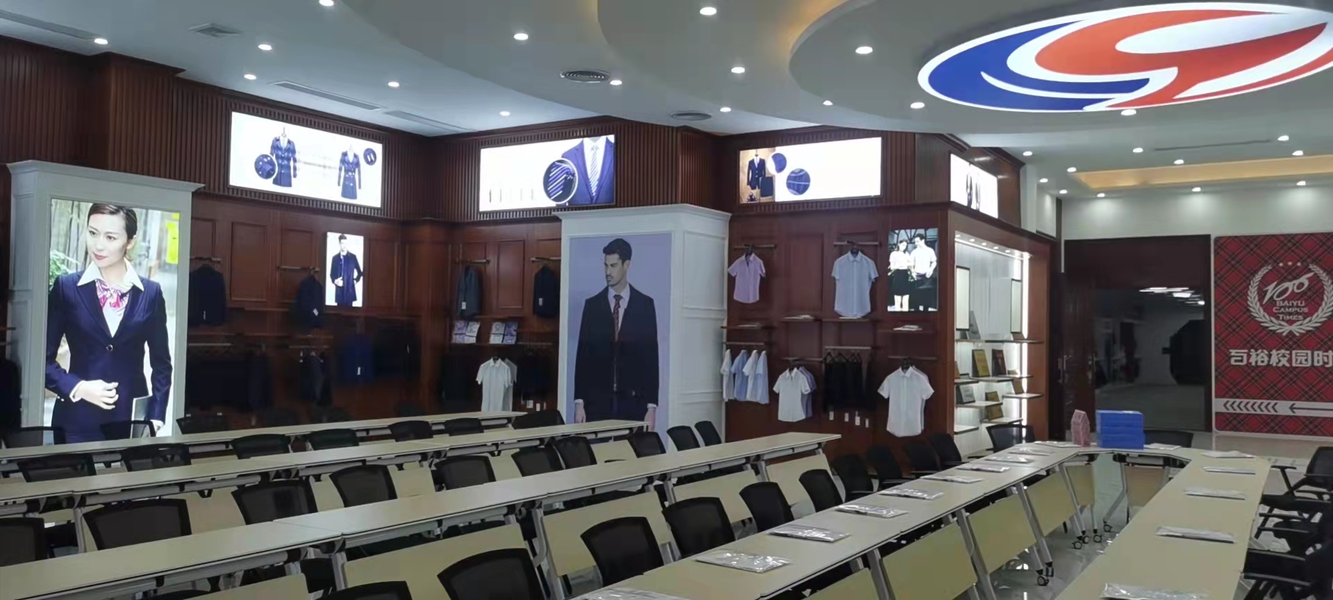 品牌館展示了百裕集團旗下百裕校園時代、喬派恩、愛樂學等品牌服飾經(jīng)典款,不同的區(qū)域裝飾風格展現(xiàn)不同的品牌個性與文化,可滿足靜態(tài)與動態(tài)不同形式的展示方式。