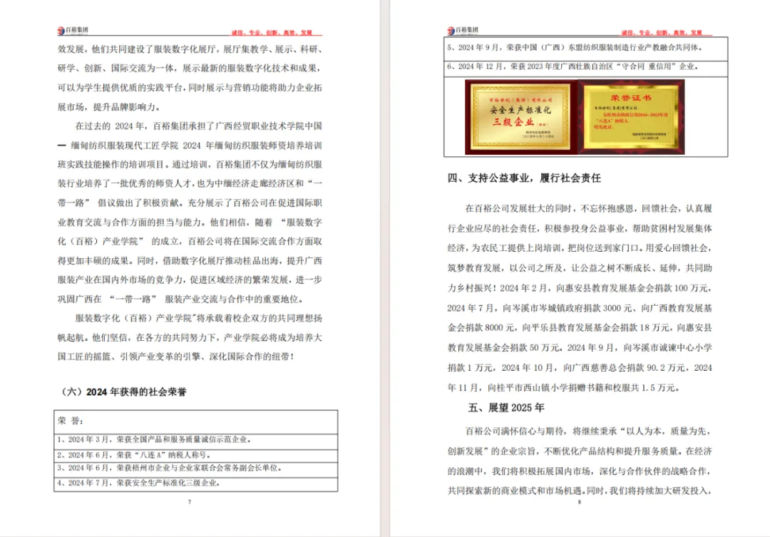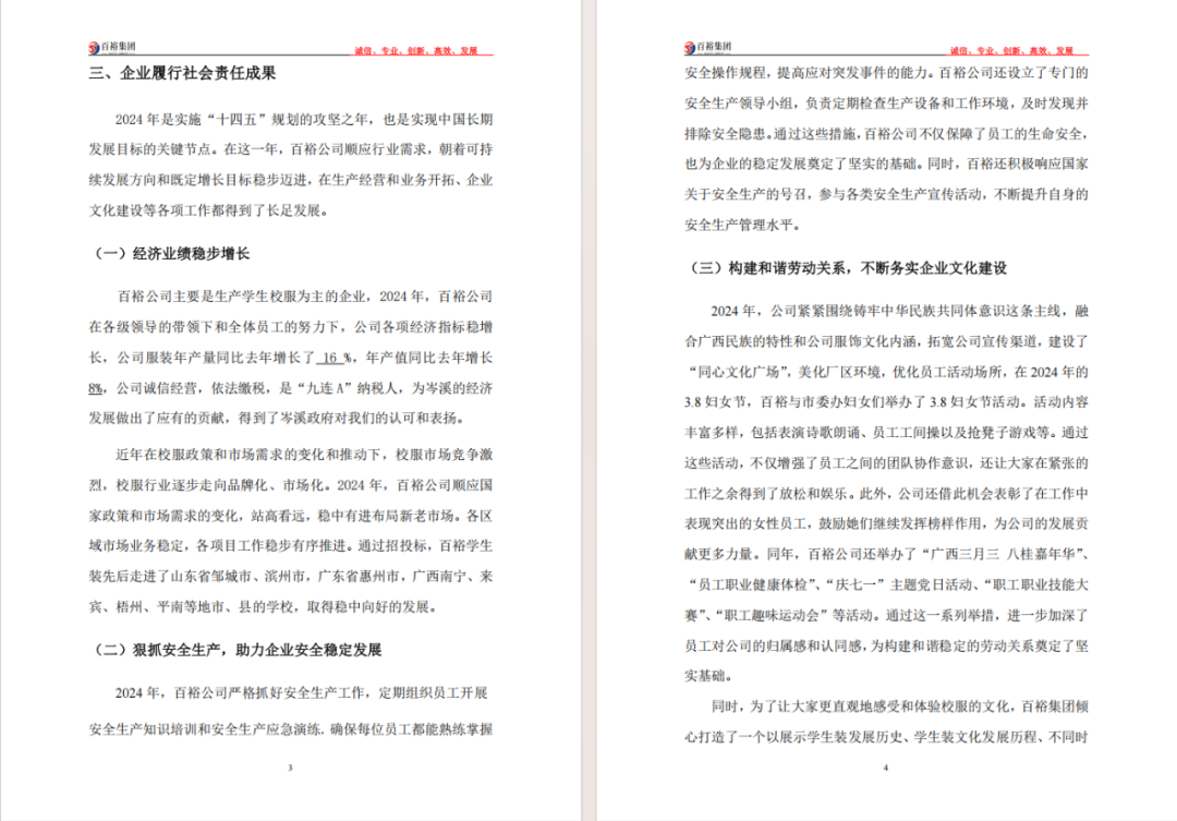 百裕集團(tuán)2024年度社會(huì)責(zé)任報(bào)告的發(fā)布,不僅是企業(yè)對(duì)社會(huì)各界的責(zé)任承諾,更是對(duì)自身可持續(xù)發(fā)展的戰(zhàn)略規(guī)劃。未來,百裕集團(tuán)將繼續(xù)秉承"時(shí)尚傳承,責(zé)任同行"的理念,以責(zé)任鑄就品牌,以行動(dòng)回饋社會(huì),持續(xù)書寫企業(yè)與社會(huì)共同發(fā)展的新篇章,為行業(yè)可持續(xù)發(fā)展和社會(huì)和諧進(jìn)步貢獻(xiàn)更多力量。