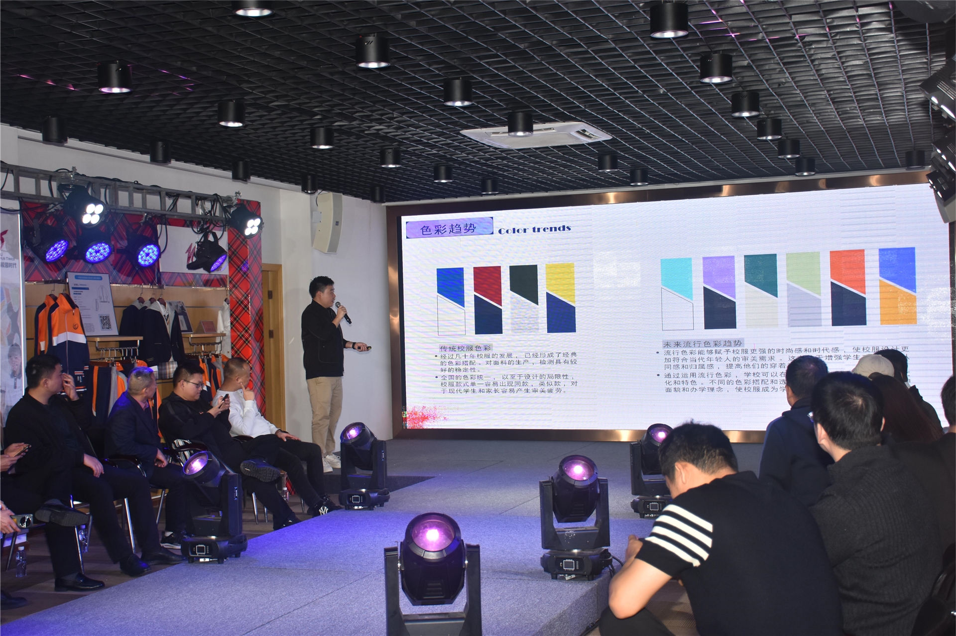 全國學生服飾南方研發(fā)中心致力于校服文化與功能的研究,款式設計等。以提升整個行業(yè)品牌推動創(chuàng)新為使命,繼而引領(lǐng)校服產(chǎn)業(yè)的升級,打造中國校服的特色,推進中國校服走向世界,弘揚中華民族文化,鑄造民族品牌。研發(fā)中心副總經(jīng)理余朝陽從色彩趨勢、結(jié)構(gòu)趨勢、面料趨勢、科技輔料、文化運用等方面分享本次新品校服的設計理念。