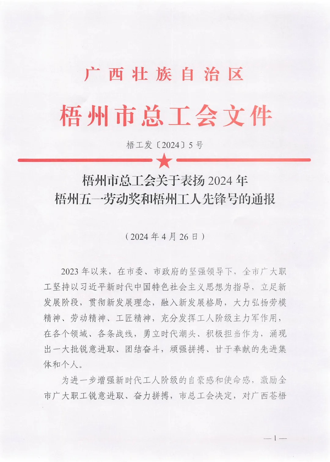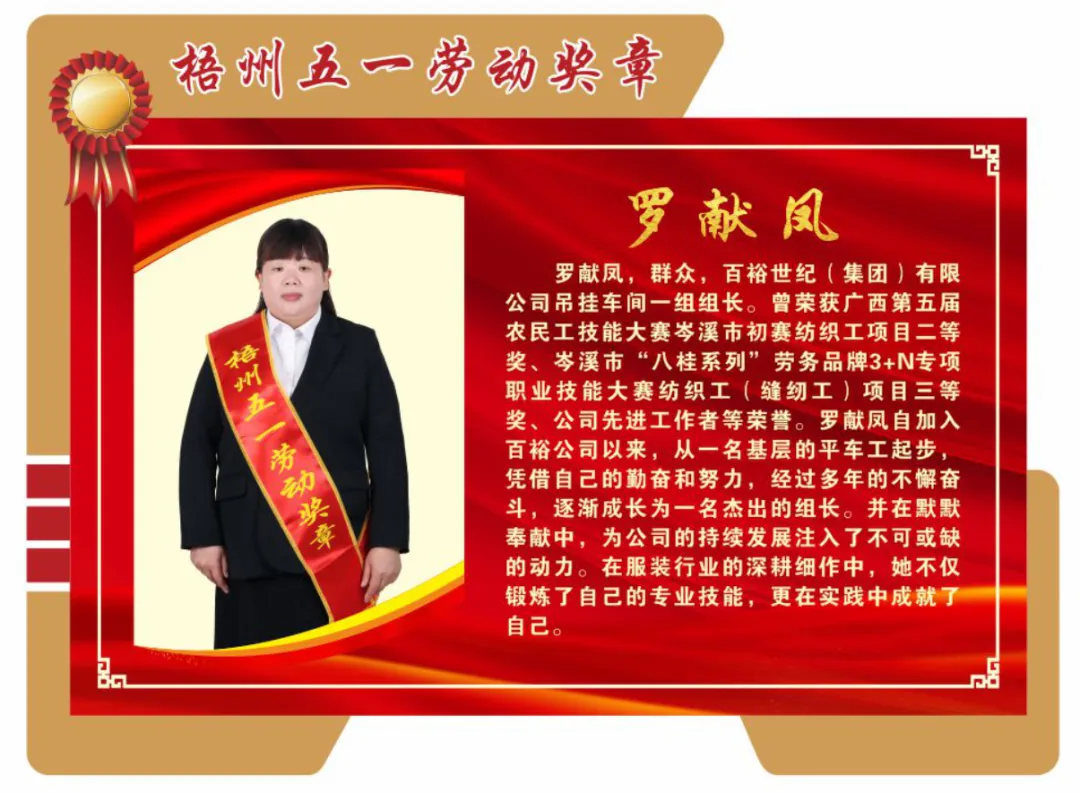 4月26日,梧州市總工會(huì)印發(fā)《梧州市總工會(huì)關(guān)于表揚(yáng)2024年梧州五一勞動(dòng)獎(jiǎng)和梧州工人先鋒號(hào)的通報(bào)》,百裕世紀(jì)(集團(tuán))有限公司羅獻(xiàn)鳳同志榮獲2024年“梧州五一勞動(dòng)獎(jiǎng)?wù)隆薄?/span>